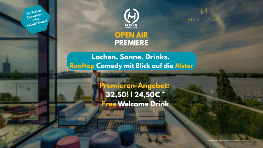 Hoch hinaus mit den besten Gags der Stadt: Jeden Sonntag laden wir dich zur exklusivsten Stand-up-Show Hamburgs ein – in der HERITAGE Rooftop Bar mit traumhaftem Blick auf die Alster. Dich erwarten 6-8 Comedians – von gefeierten Profis bis zu den spannendsten Newcomer:innen. Und wenn das Wetter mal nicht mitspielt? Kein Problem: Wir ziehen in den stylischen Innenbereich um. Die Show findet immer statt!